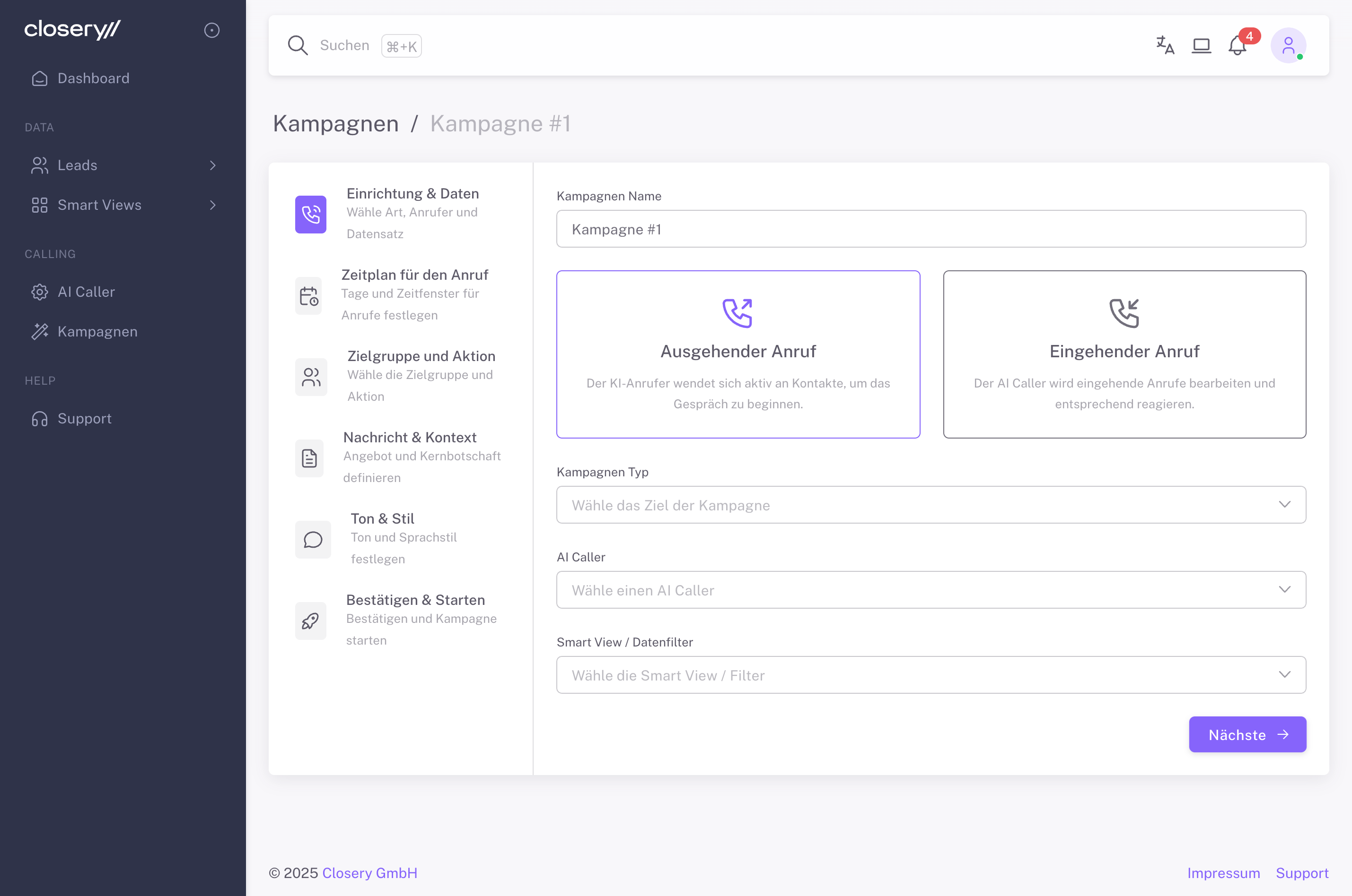 Aktuell liegt der Fokus auf Outbound Calls. Inbound-Funktionalitäten sind bereits vorgesehen und werden Schritt für Schritt ergänzt, um Closery perspektivisch noch flexibler zu machen.